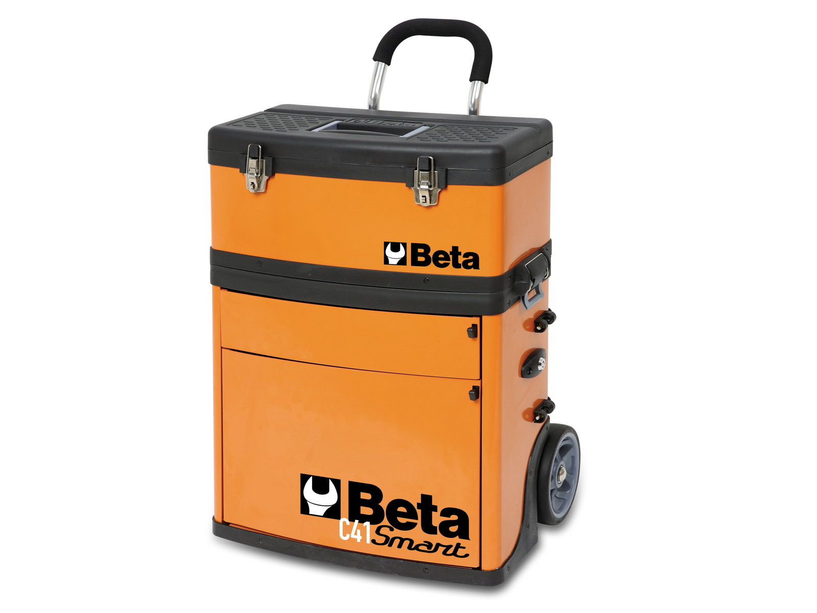 • Ramme i pladejern og plastiktopper, der sikrer robusthed og reduceret vægt. • 2 aftagelige moduler: 1 øvre værktøjskasse, 1 modul med 2 skuffer, henholdsvis 95 mm og 295 mm høje. • Overdimensionerede hjul (160 mm), integreret i rammen for nem transport - eksempelvis på trapper. • Side-centraliseret lås til lukning af skufferne i det nedre modul. • Skuffer med kuglelejeskinner og dobbelt lukkekrog. • Teleskopisk aluminiumshåndtag. • Lille værktøjsholder integreret i den øvre værktøjskasse. • Nederste skuffe med dobbelt kuglelejeskinne, hvilket sikrer en glidende og stabil bevægelse.