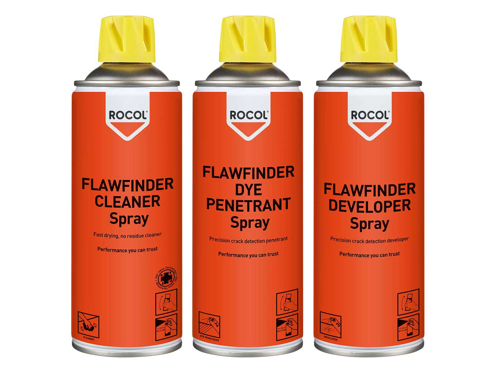 ROCOL FLAWFINDER SPRAY 1-2-3 er et komplet sæt med 3-dåser og er en hurtig, sikker og effektiv metode til detektion af kritiske fejl og revner på svejsesømme, metalkomponenter, keramik, glas o.s.v.